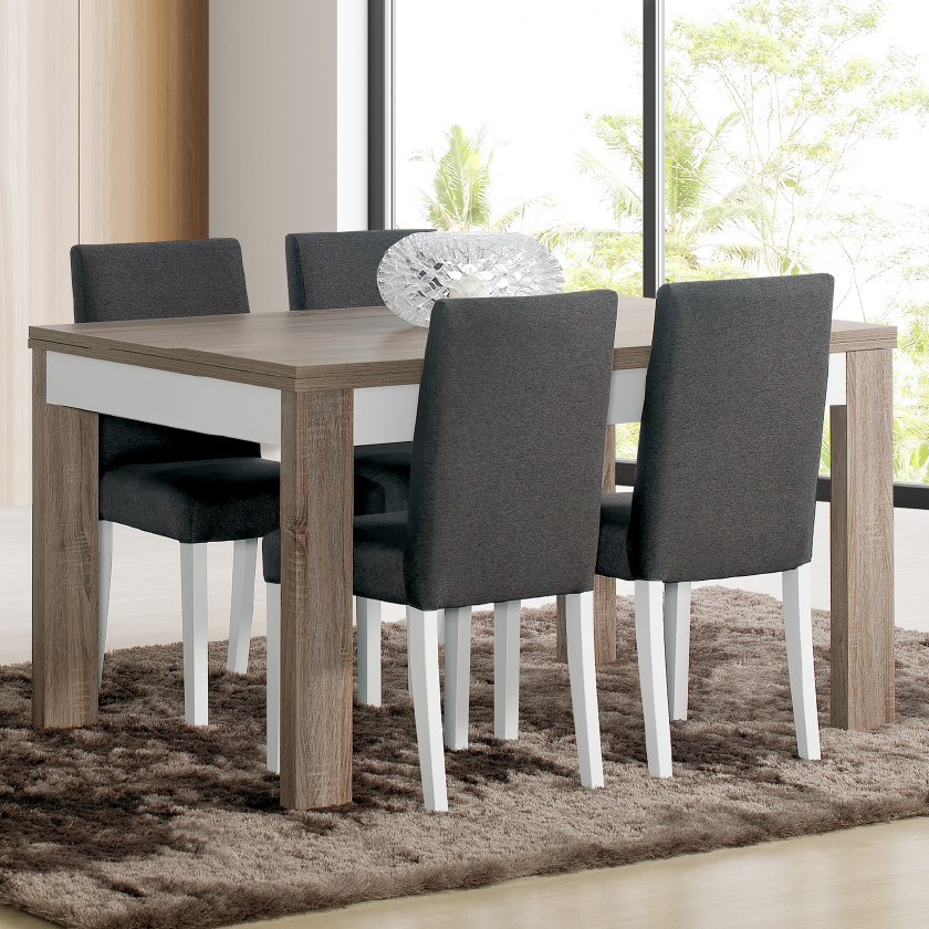 Mesa de jantar com topos extensíveis e estruturas em madeira maciça. A combinação de cores branco com carvalho garante um aspeto contemporâneo e acolhedor à sua divisão.