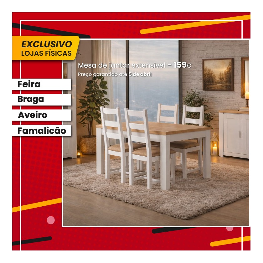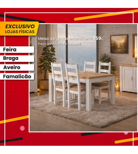 Mesa de jantar com topos extensíveis e estruturas em madeira maciça. A combinação de cores branco com carvalho garante um aspeto contemporâneo e acolhedor à sua divisão.